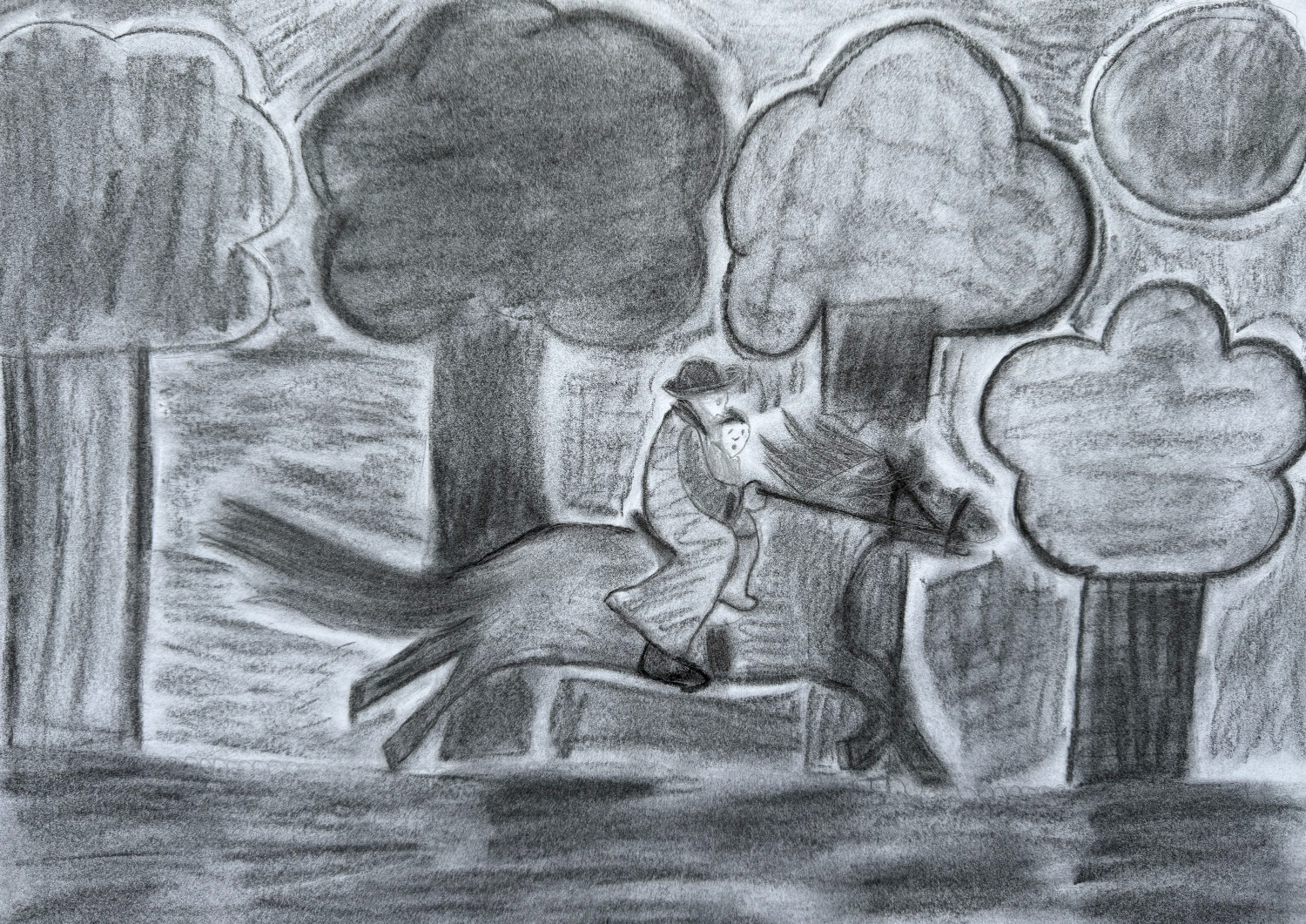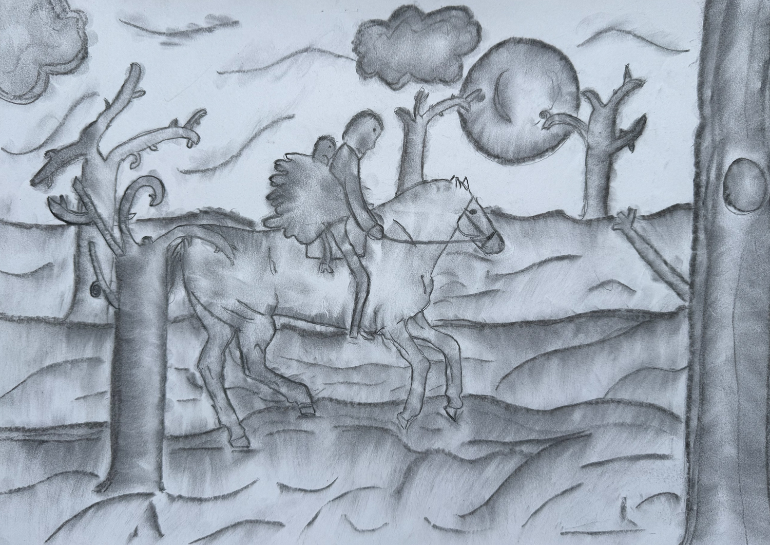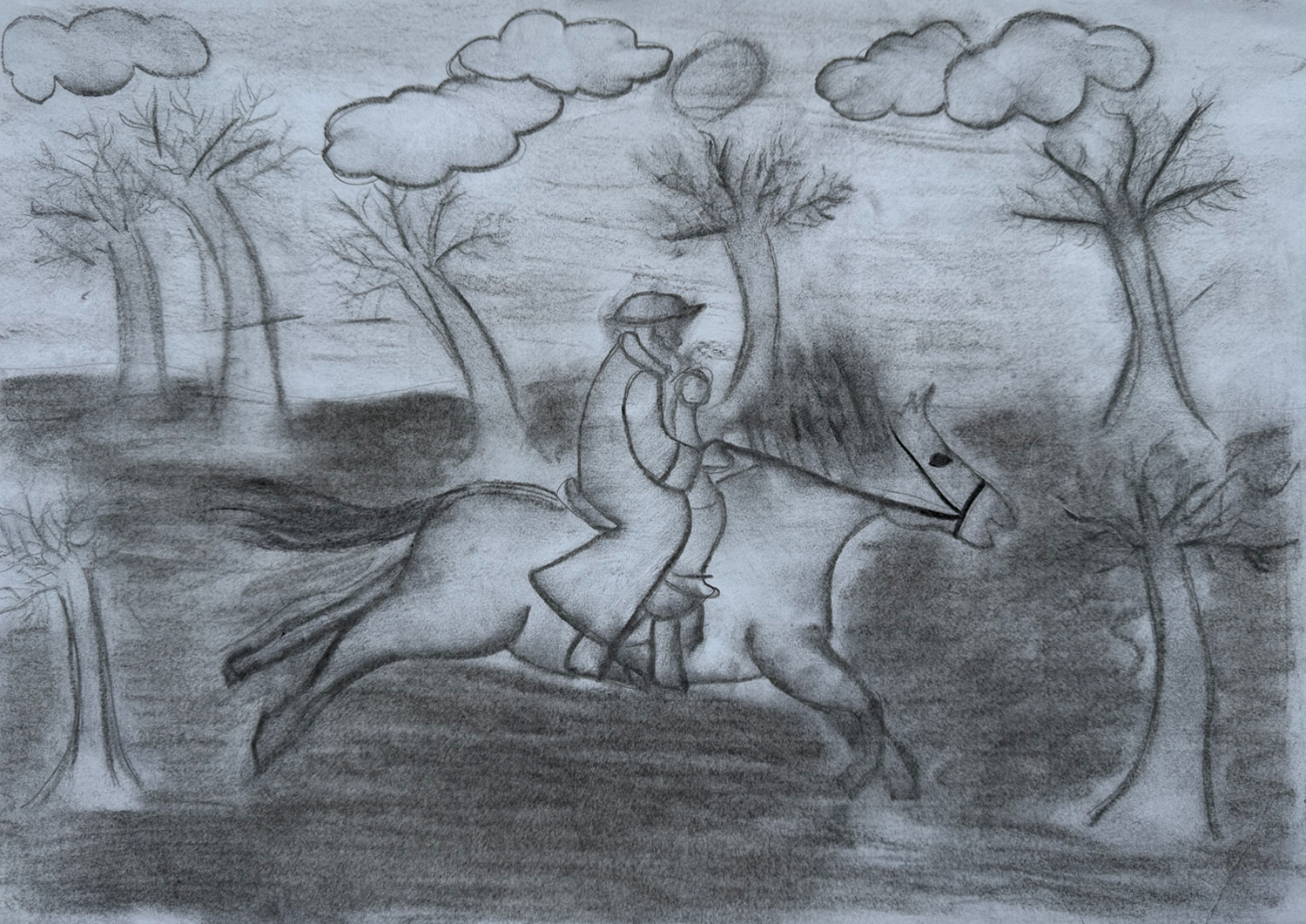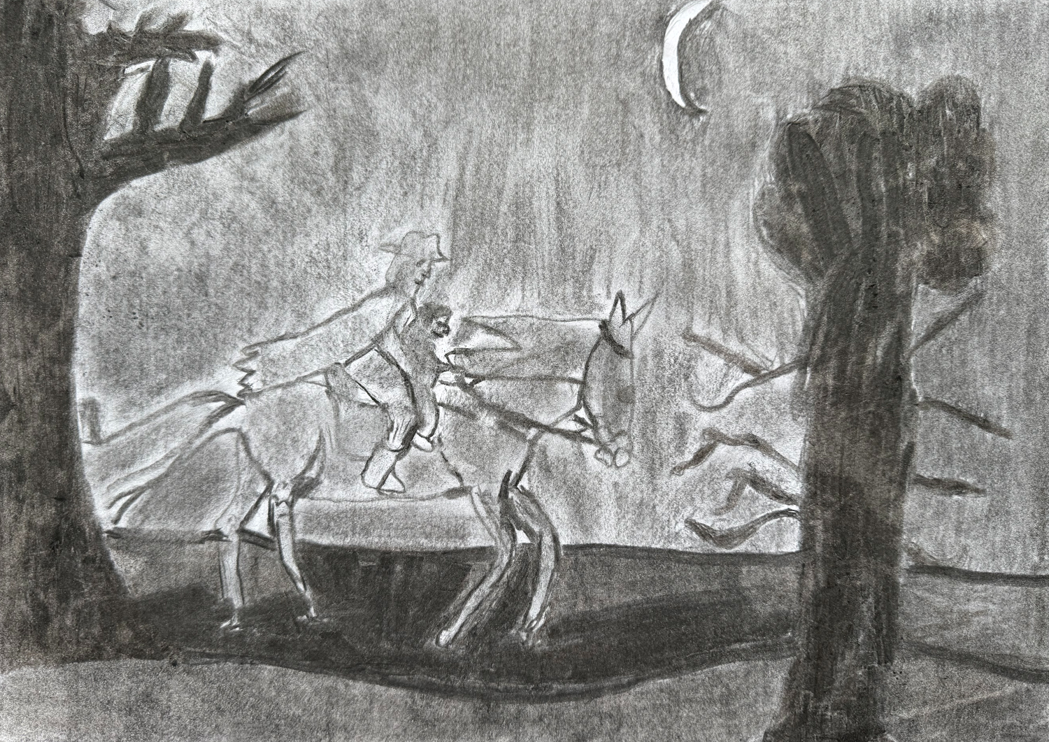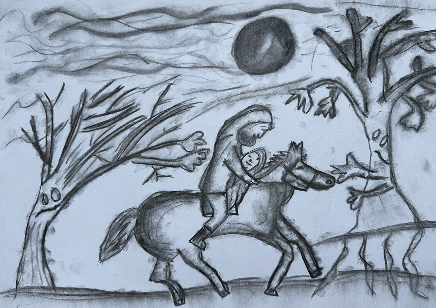 Erlkönig 2026/01/20 | 2025-26, Klasse 7, Kohlezeichnung Aufgabe: Fertige eine Kohlezeichnung zu Goethes Gedicht „Erlkönig“Technik: KohlezeichnungKlassen: 07 – Schuljahr 2025/2026Kunstlehrer: C. Barth Tobias Ballmann Paul Bohr Marit Heinz Maila Lange Luis Heinz Fabian Mans
