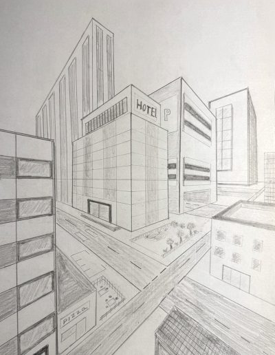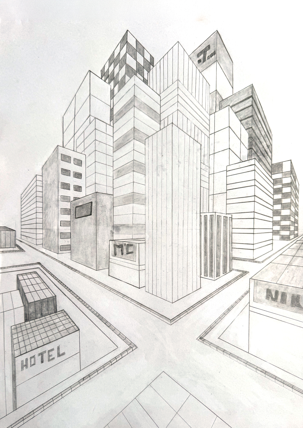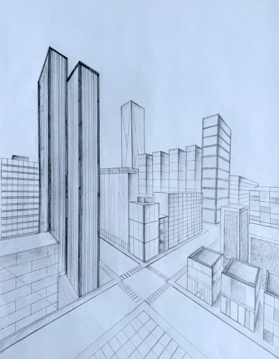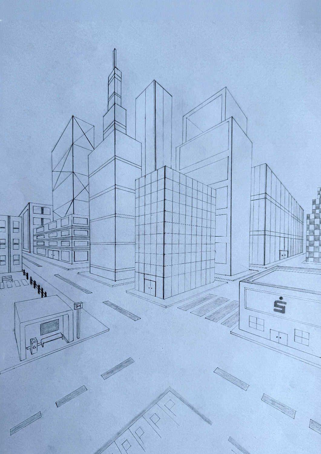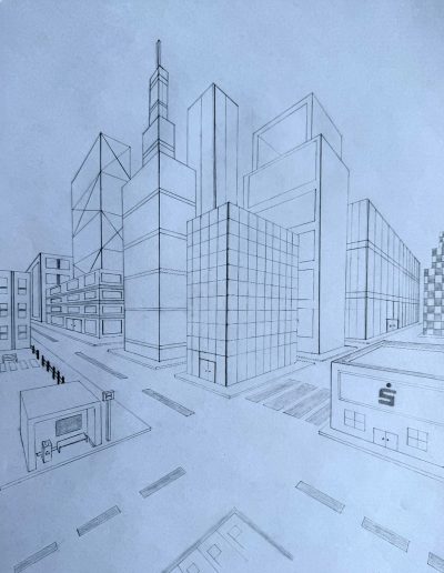 Skyline 2026/02/10 | 2025-26, Bleistiftzeichnung, Klasse 8, Perspektive, Zeichnung Aufgabe: Großstadtansicht in ZweipunktperspektiveTechnik: BleistiftzeichnungKlassen: 08 – Schuljahr 2025/2026Kunstlehrer: Christoph Barth Timon Hermes Maja Haller Jonah Lichter Elias Netzer Cheyenne Faber Arved Langer