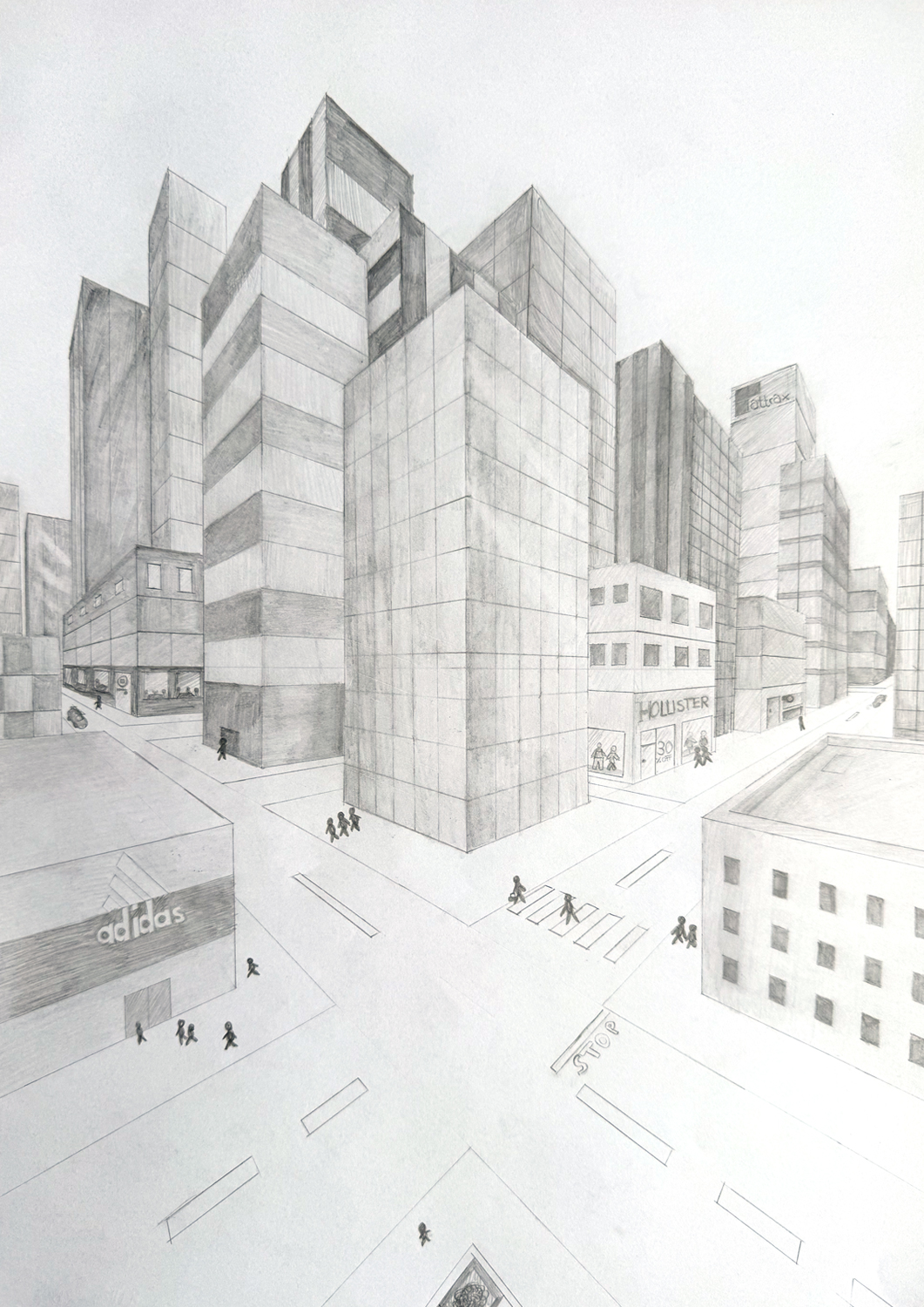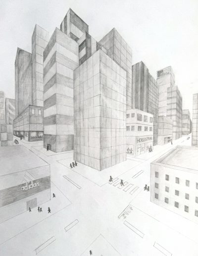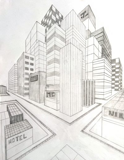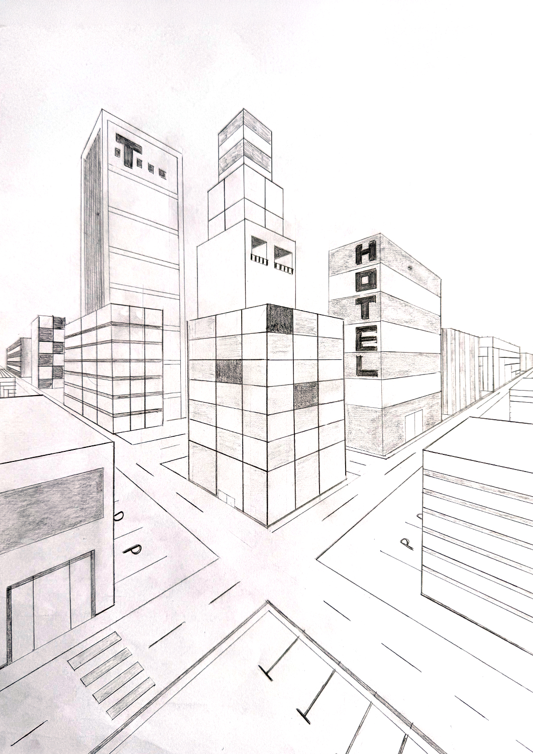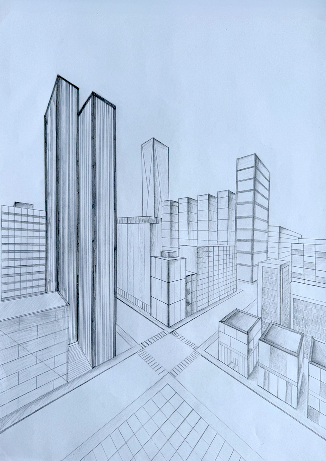 Skyline 2026/02/10 | 2025-26, Bleistiftzeichnung, Klasse 8, Perspektive, Zeichnung Aufgabe: Großstadtansicht in ZweipunktperspektiveTechnik: BleistiftzeichnungKlassen: 08 – Schuljahr 2025/2026Kunstlehrer: Christoph Barth Timon Hermes Maja Haller Jonah Lichter Elias Netzer Cheyenne Faber Arved Langer